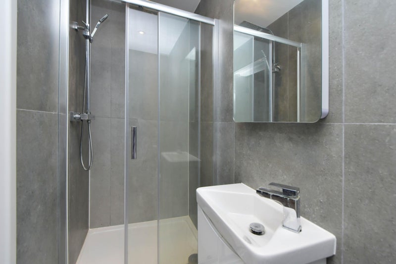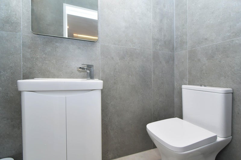 * The ensuite bathroom features stylishly designed porcelain tiles, contemporary sanitary fittings, a mains-powered shower, an LED-illuminated mirror and ample vanity storage.