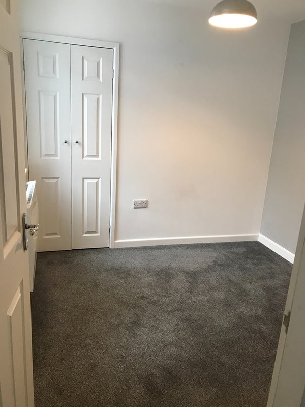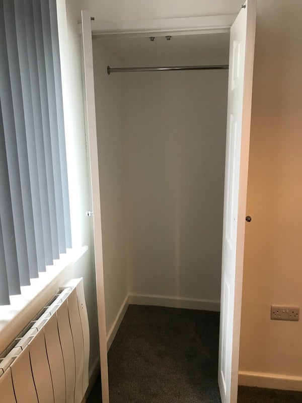 The bedroom is a double bedroom, carpeted and has a built-in wardrobe.