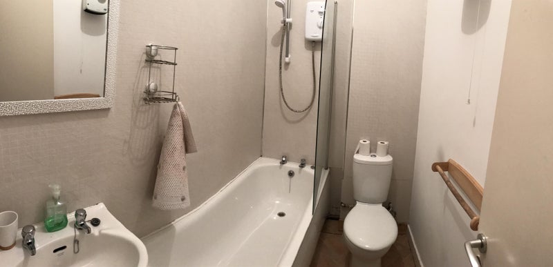 Bathroom - has bath with electric shower, toilet and wash hand basin.