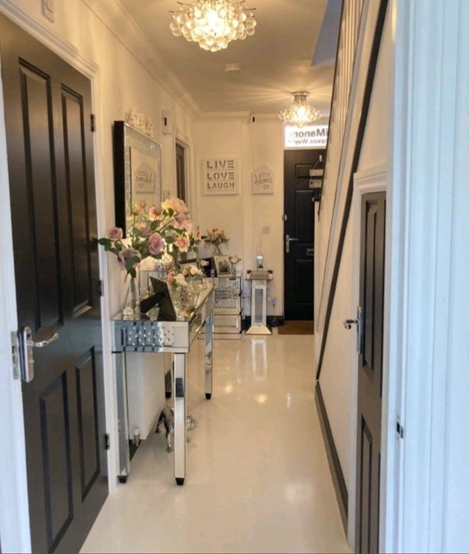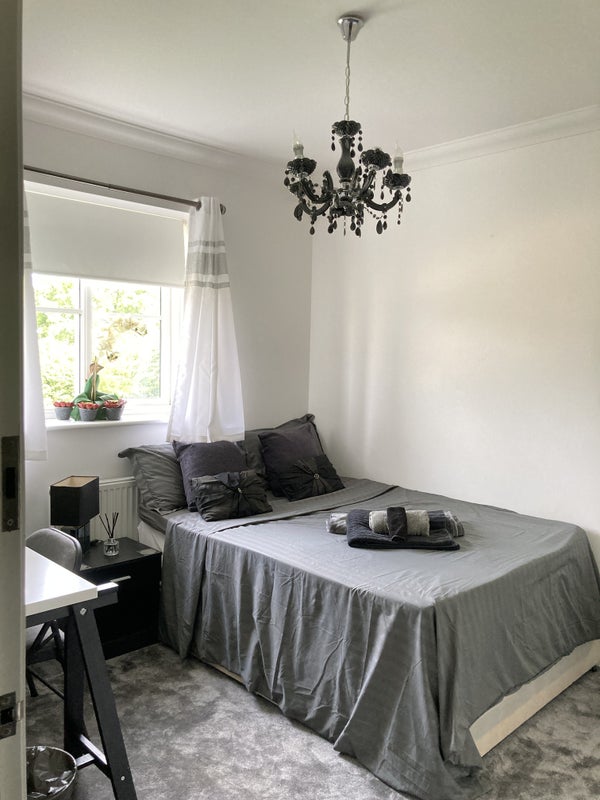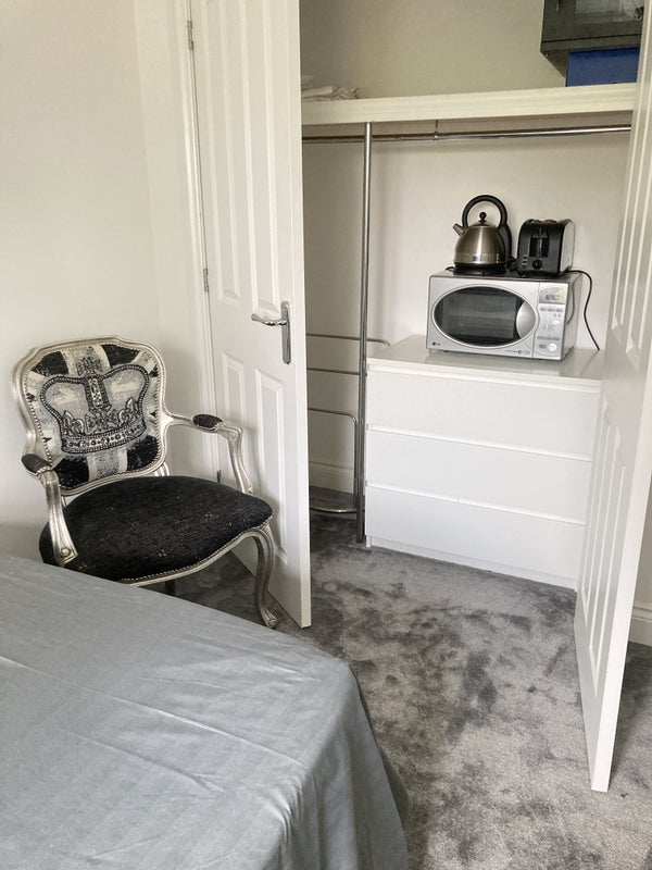 Equipped with a double bed with bedding if required, desk and chair, large tv, huge wardrobe with drawers, microwave, toaster, and kettle. Bedside drawer and light. Situated at the rear of the property.