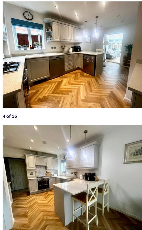KITCHEN/BREAKFAST ROOM 17' 6" x 10' (5.33m x 3.05m) Through wooden door leads into the kitchen/breakfast room with herringbone flooring fitted, generous amount of high and low level cupboards, fitted worktops including breakfast bar inset ceramic sink unit with mixer tap, built-in stainless steel double oven, four ring hob, extractor fan connected over, space and plumbing for dishwasher, low level fridge, radiator, window to the side aspect, French doors opening to the conservatory.