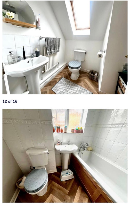 WC low level w/c, sink and pedestal, wall radiator, double glazed window, herringbone flooring