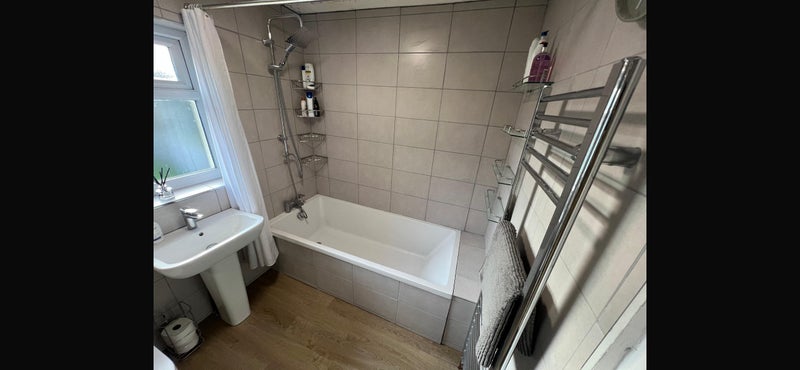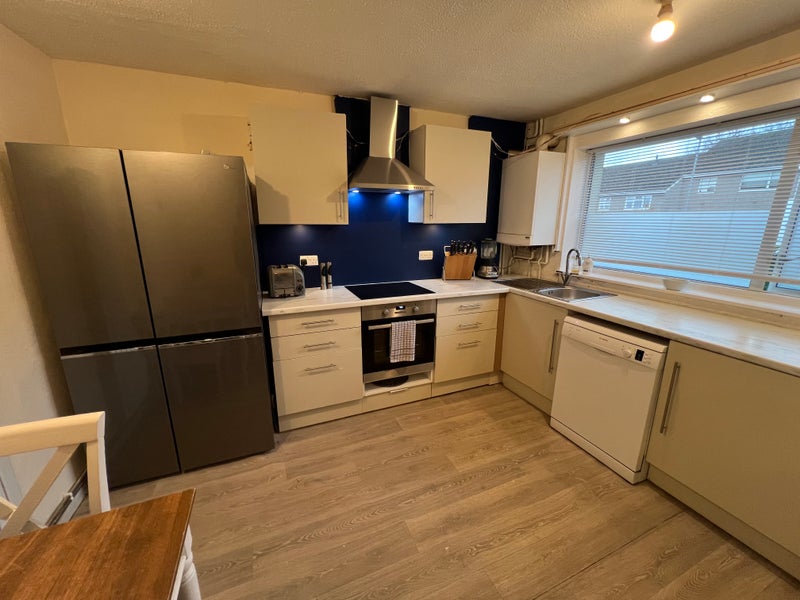 We have a shared bathroom with a rain shower head over the bath. The kitchen has recently had a refit with new appliances and a large dining table. The downstairs WC is fitted with the washing machine.