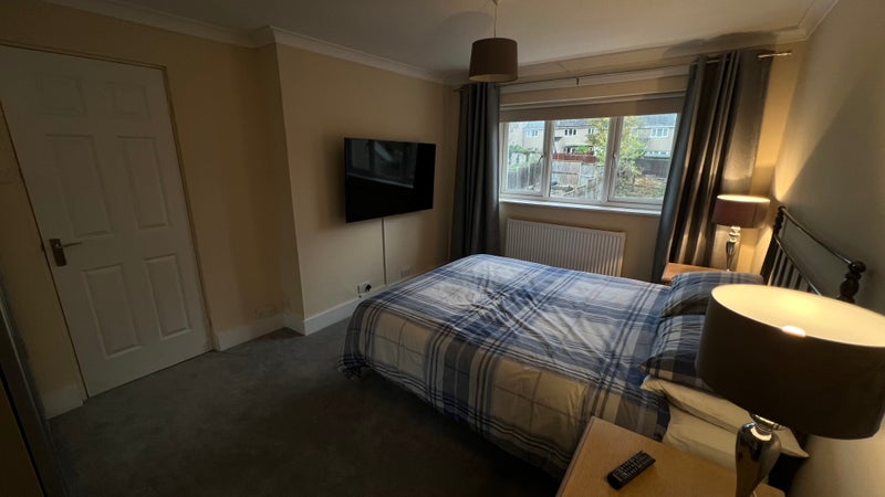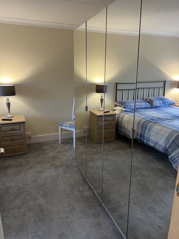 Large Double room available (10.8 x 14ft) in Haverhill with a wall mounted 55 Inch Samsung TV, 4 New wardrobes, 2 Side cabinets with lamps and a chair. This room has a king-size with a steel headboard.