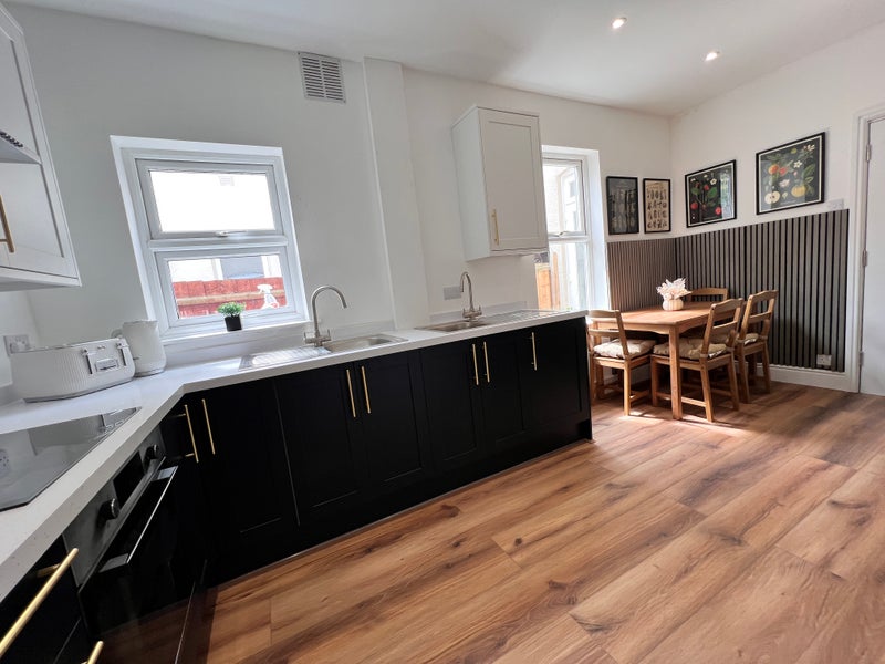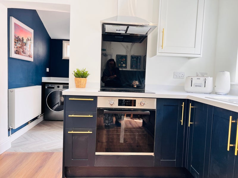 • Fully kitted-out modern kitchen with sleek navy & gold cabinetry, cosy dining area, high-end appliances (including Ninja duel air fryer, microwave, washing machine & dryer), two sinks and ample designated cupboard space for each bedroom.