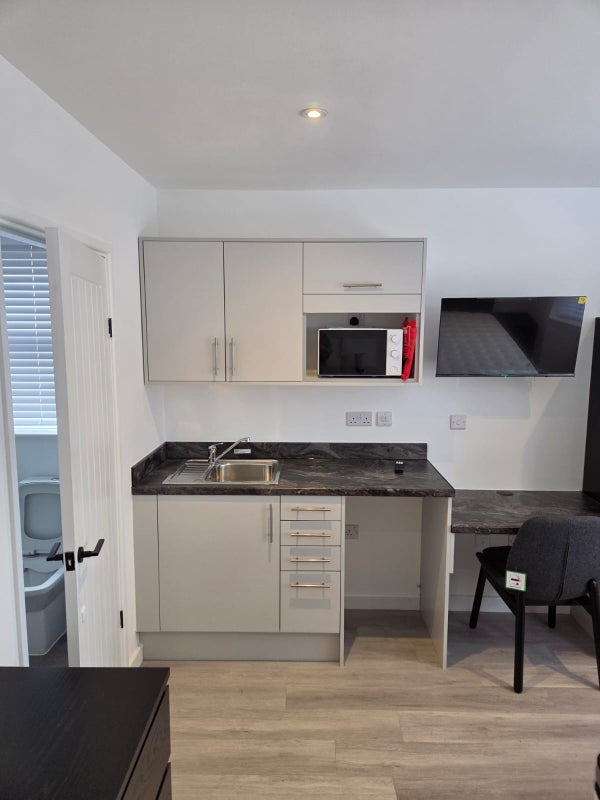The room itself provides everything you could want: a TV, fully furnished bedroom, a lovely and spacious ensuite, private fridge/freezer, microwave, and kitchen sink.