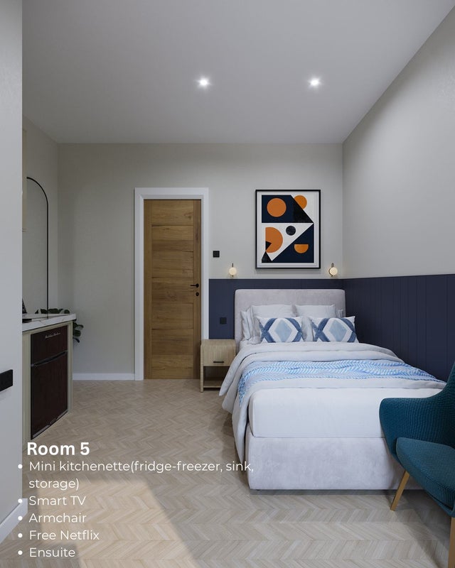 ✅ Fully furnished-to-move-in: double bed, wardrobe, smart TV, couch/armchairs, desk & study chair