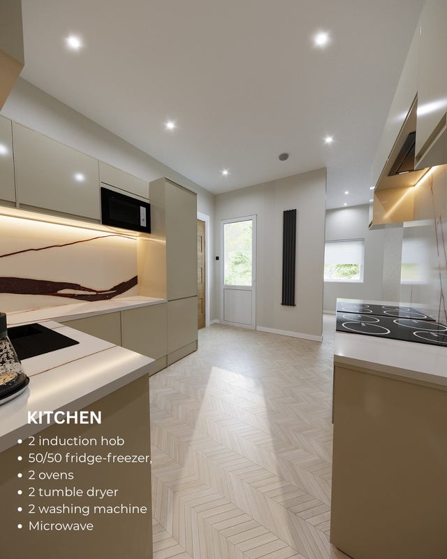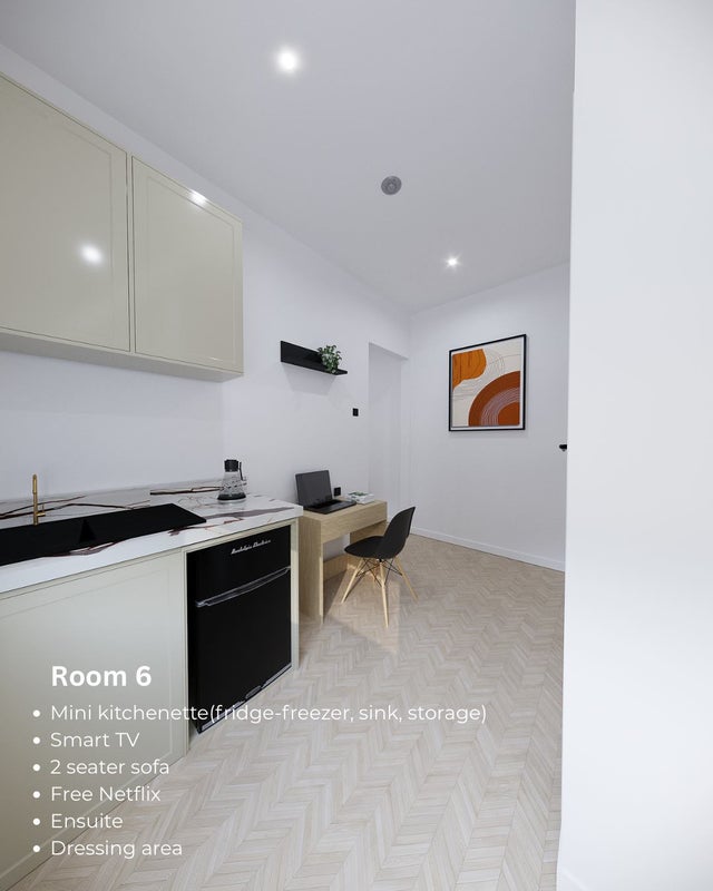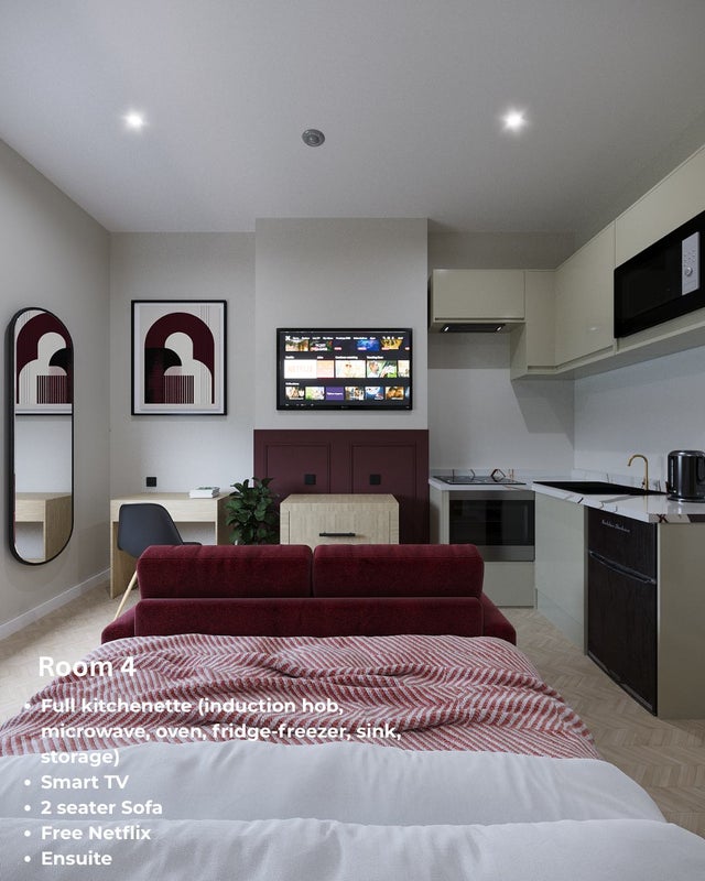 ✅ Full Kitchenette- Room 4 comes with induction hob, oven, fitted extractor hood, microwave, fridge-freezer and storage