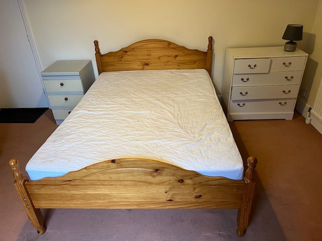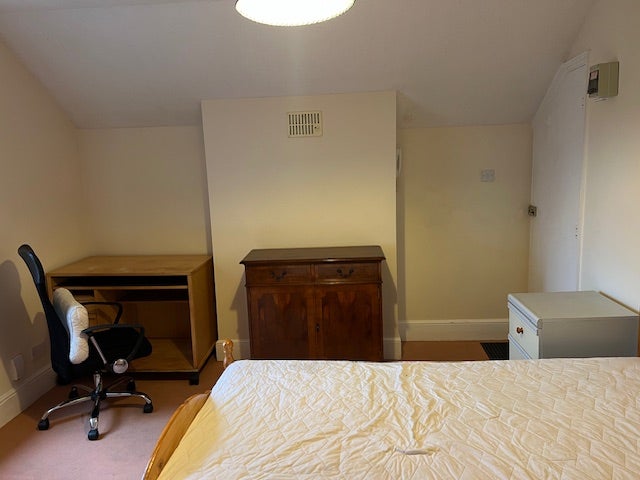 A shared house, Nice size room with pine double bed round table, two pine wardrobes, a work station, painted, bedside cabinet, chest of drawers and a pine bed table. There is a great view of the public park across the road.