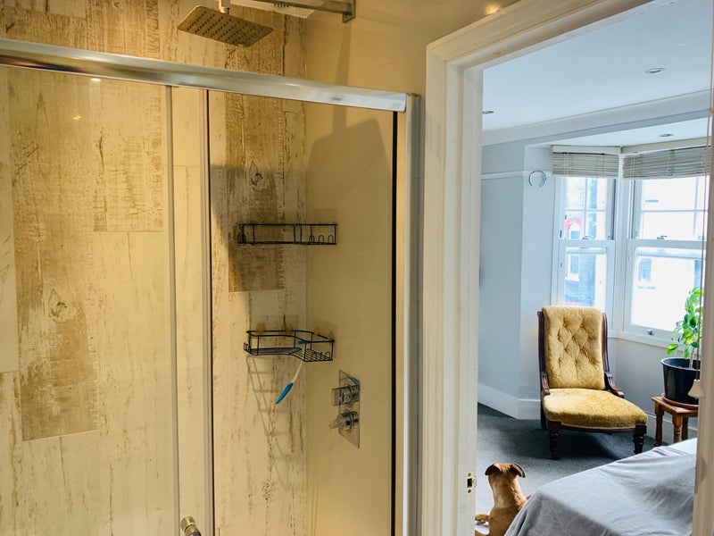 Private shower room and open fireplace