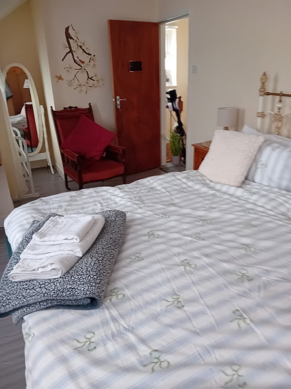 Top floor large comfortable room with desk, smart Tv, own shower and toilet, fully furnished and serviced once a week, linen provided plus towels if required