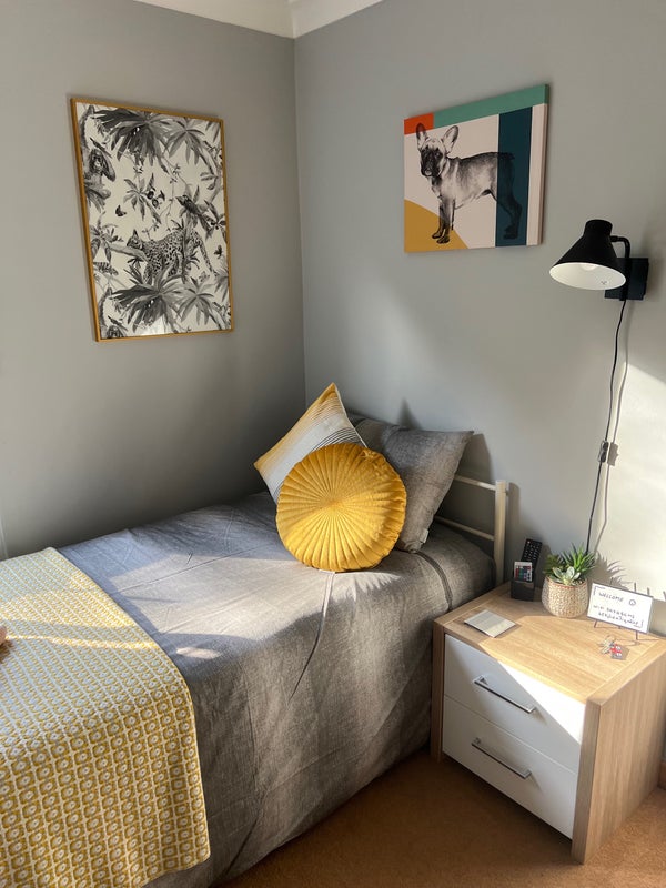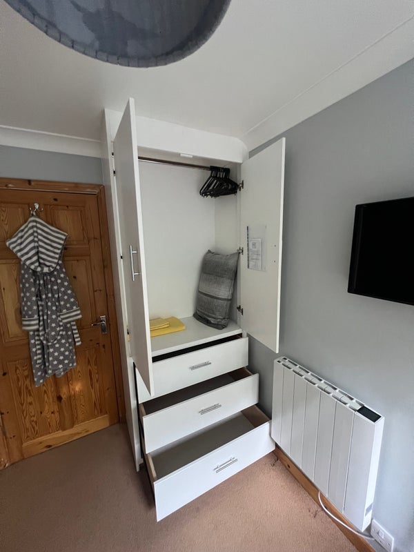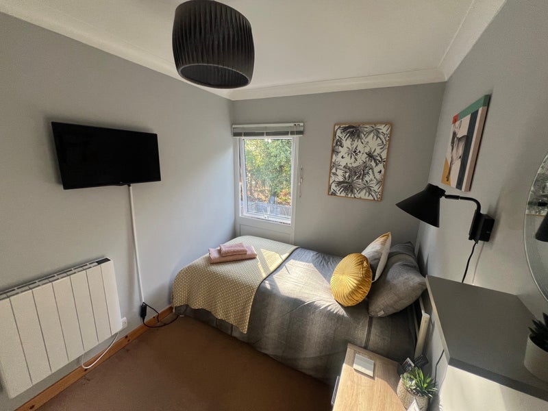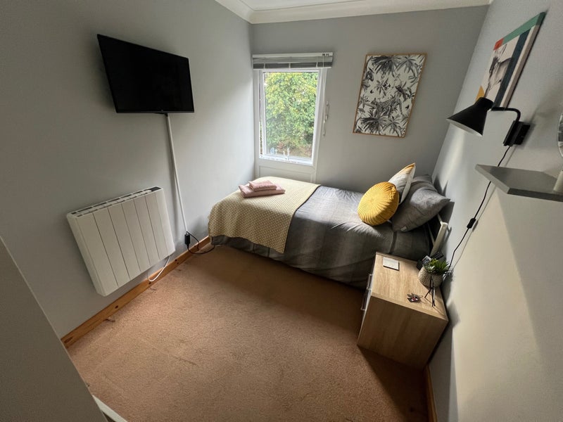 With brand new single bed and new mattress be the first to sleep in it!! smart TV includes access to Netflix, Amazon Prime Video and all the usual channels already signed in and ready for viewing. New digital electric radiator which you will have full control over setting ur desired temperature can be put on a timer so the room is toasty when you walk in or wake up. Brand-new bedding and all soft furnishings included, wall art and wall lamp. Full length mirror and smaller mirror with shelf and coat hocks. Very large wardrobe with 3 very large deep drawers.