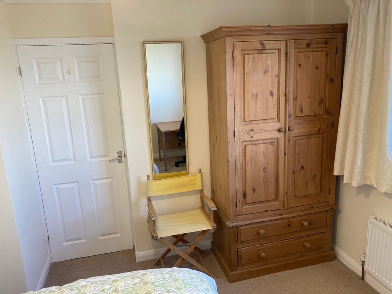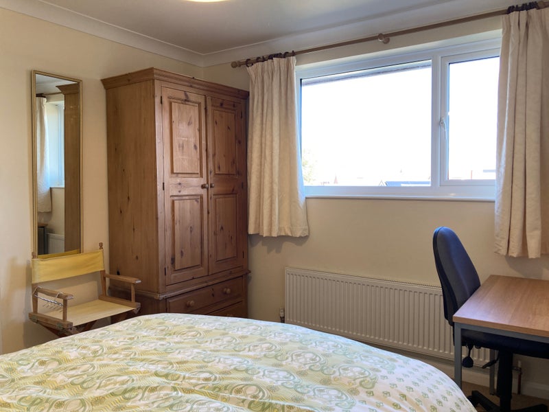 The room is bright and light with a double bed, large wardrobe, desk and chair.