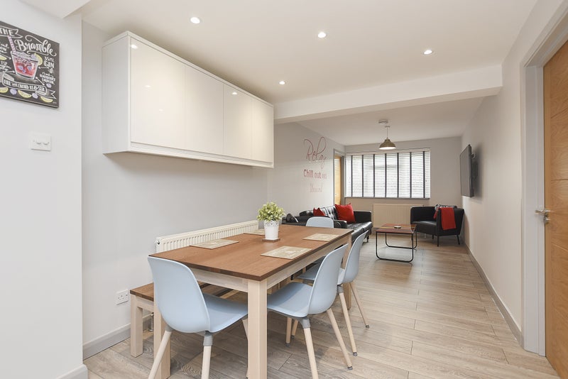 🖥 A bright and spacious communal area that opens onto a beautifully landscaped private garden, featuring a low-maintenance artificial lawn, an outdoor table for al fresco dining or relaxing, and a BBQ — perfect for enjoying summer evenings. Inside, you'll find a dedicated dining space and a generous lounge with a 55” TV.
