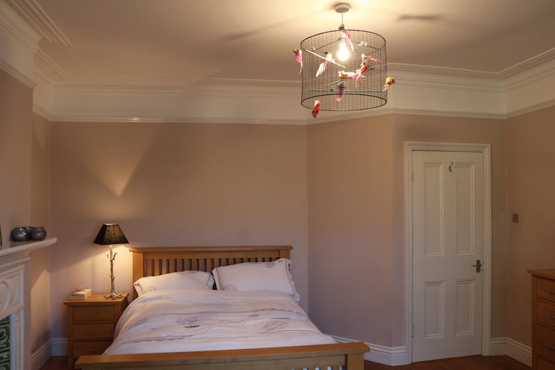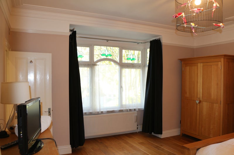 This en-suite bedroom (4.9m x 4.5m) is huge, full of natural light with a bay window, fireplace and lots of storage. It's quiet and airy, has a big wardrobe, chest of drawers, sofa, big king size bed with additional storage under the bed. Very cosy and peaceful.