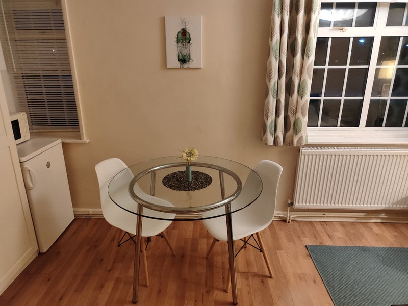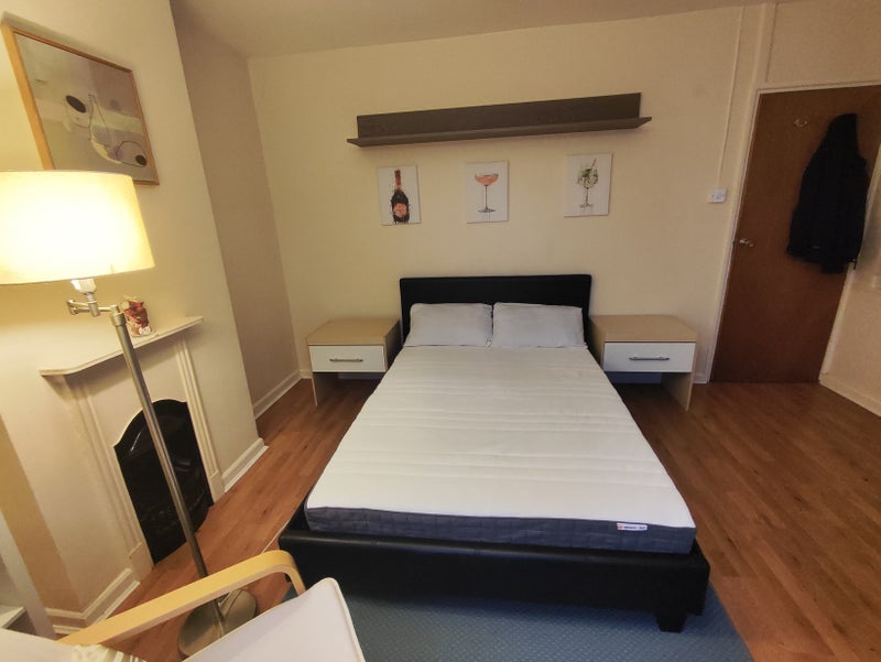 The room is very big and bright, and contains a double bed, bookcase, wardrobe, table and chairs, Microwave and Fridge-freezer. Main Kitchen and bathroom to share.