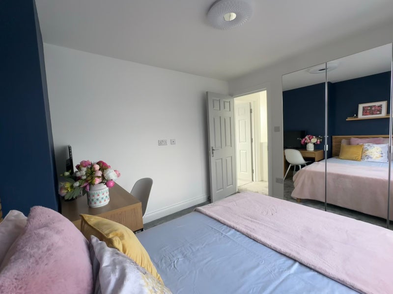 • Furnished with wardrobe, bedside table, double bed, desk, and chair