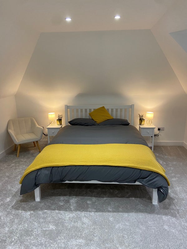 Step into your freshly decorated, dedicated second-floor double room, featuring all-new John Lewis furniture. You'll find a comfortable king-size bed for a great night's sleep, along with a cozy armchair for relaxing. The room is fully equipped offering a chest of drawers, a hanging rail, and a dedicated desk and chair for any work you need to do. Wake up to lovely views over Oxshott Heath.