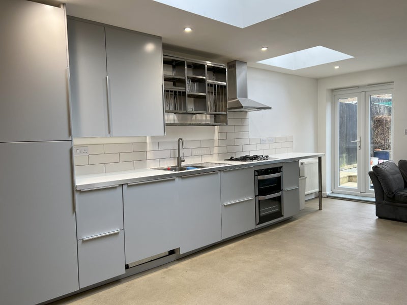 The house has three floors and features a large reception room, a modern open-plan kitchen/diner, two shared modern bathrooms, utility room/mini kitchen, and an enclosed garden. The two available bedrooms are located on the upper and lower floors.
