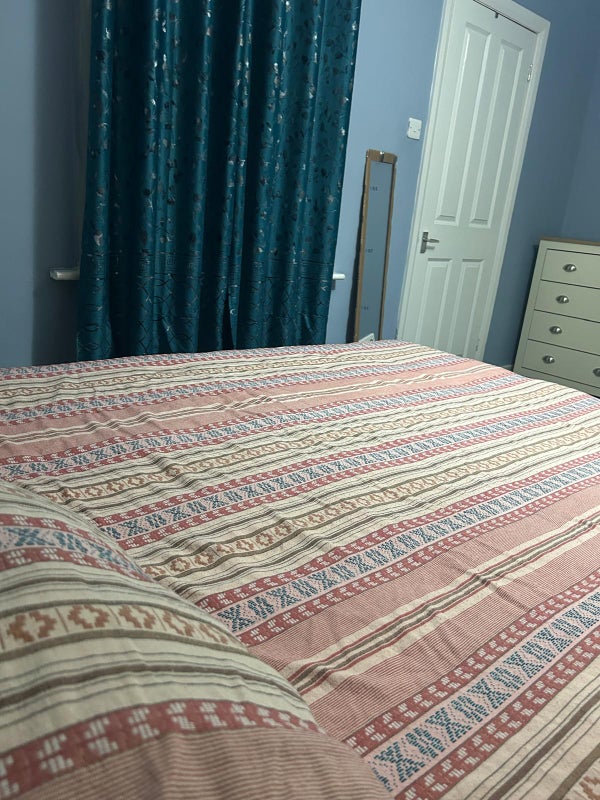 This is a double bedroom with a spacious bathroom in a 2-bedroom house that includes separate dining and drawing rooms. Outdoor grill available.