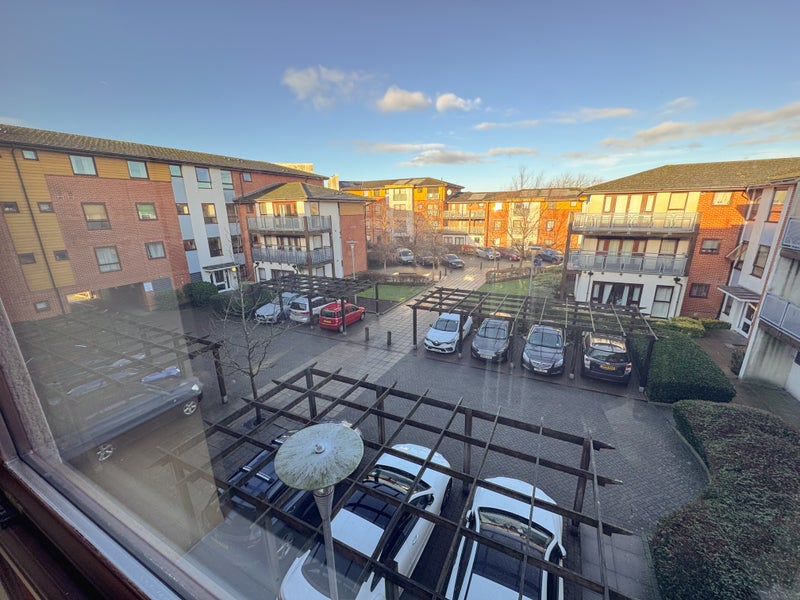 Shared spaces include a very spacious living room with a recliner sofa, large flat-screen TV and dining table, as well as a good-sized kitchen with an electric hob and ample storage. The flat benefits from excellent natural light throughout and a large private balcony with open views. There is also a communal garden and private resident parking.