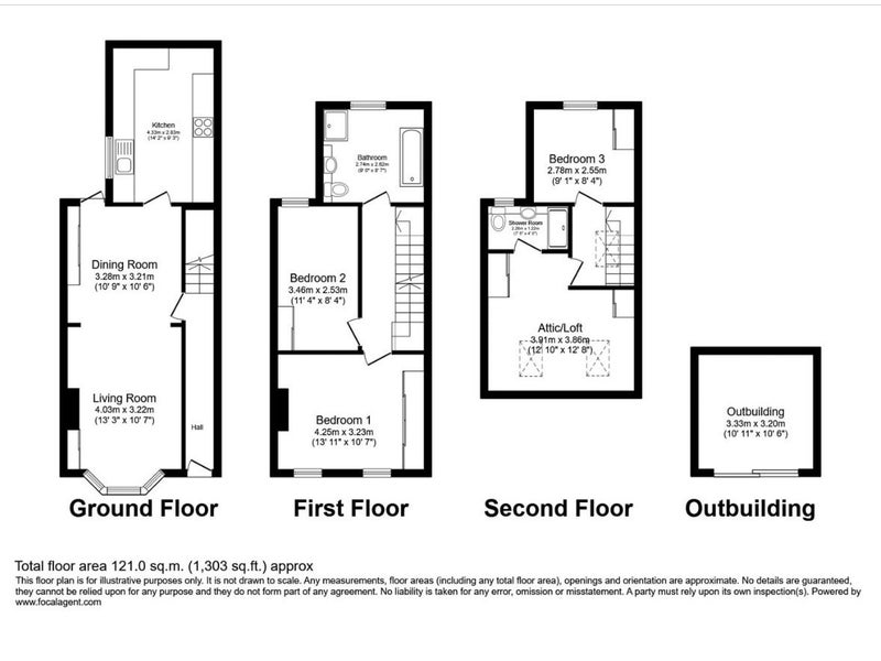 Floor plan: second floor entirely yours, first floor entirely mine, ground floor and outhouse shared.