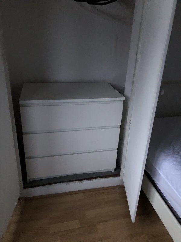Large kitchen with mod cons. Refurbished bathroom (upstairs) with bath and shower. Room has laminated floor, own fridge, masses of wardrobe space, chest of drawers, double bed (& storage boxes), new mattress – to be delivered for new tenant, mirror & clothes airer. Tidy house with double glazing, gas central heating and laundry room to dry clothes etc. 5 weeks deposit.