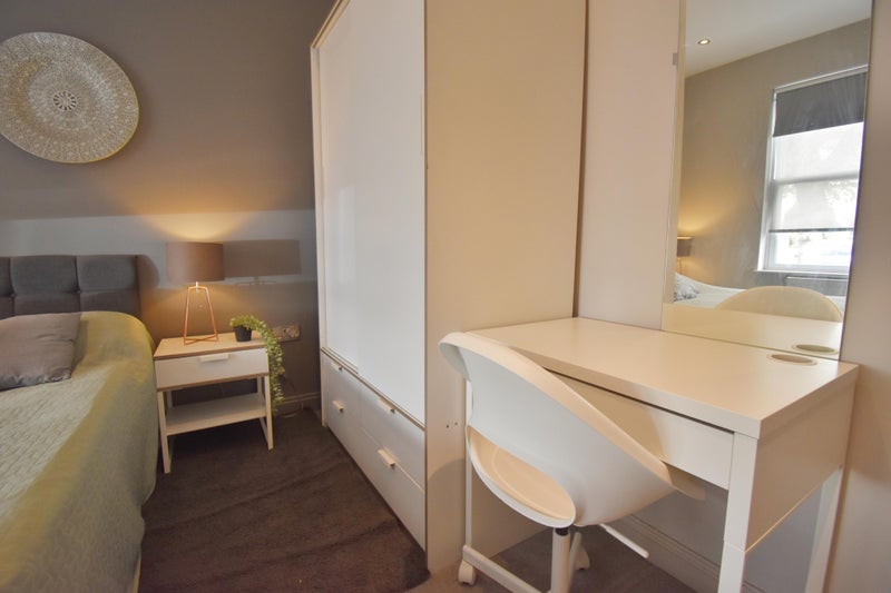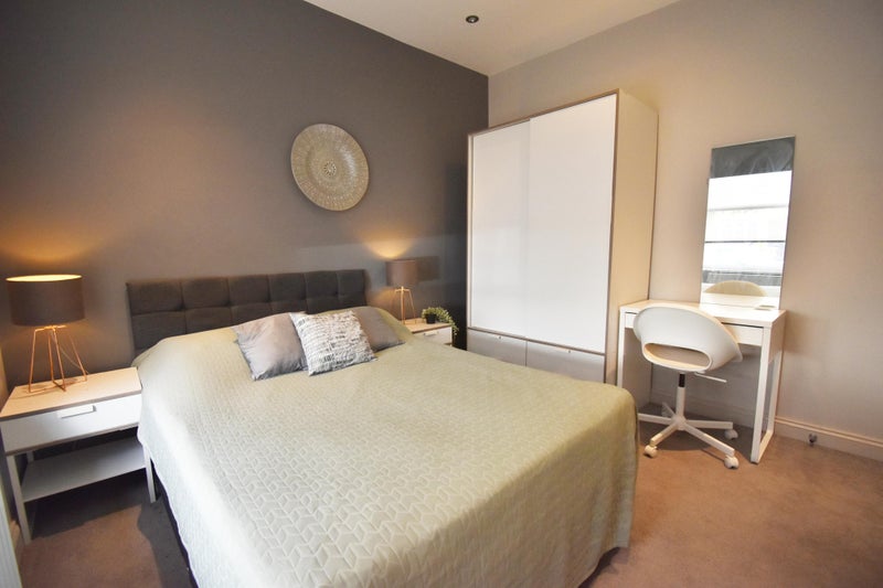 This gorgeous room (shares bathroom with just 1 other person) is presented to a 5 star hotel standard and comes fully furnished with double bed and pocket sprung mattress, 2 x bedside tables, double wardrobe, DESK & CHAIR, chest of drawers and blackout blinds.