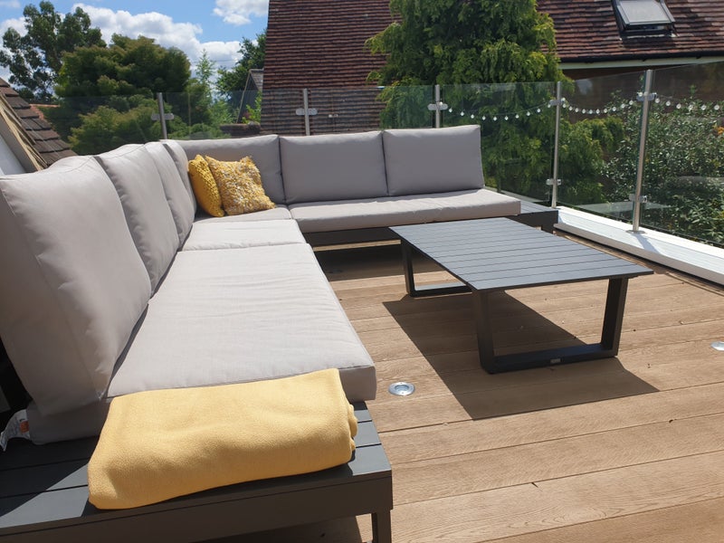 Open plan kitchen/lounge - this has double doors leading out to a large roof terrace with L-shaped sofa, coffee table and olive/lemon trees. The terrace has a wooden deck, and a double power socket, and floor uplighters for night-time.