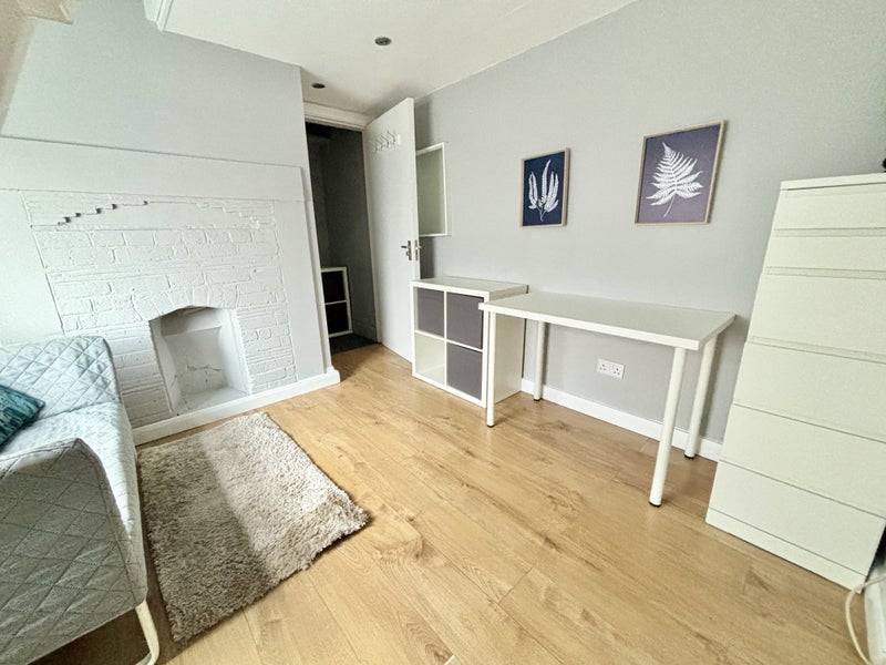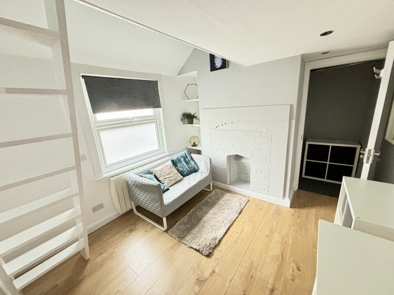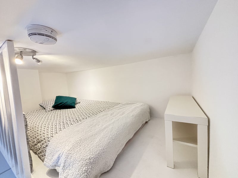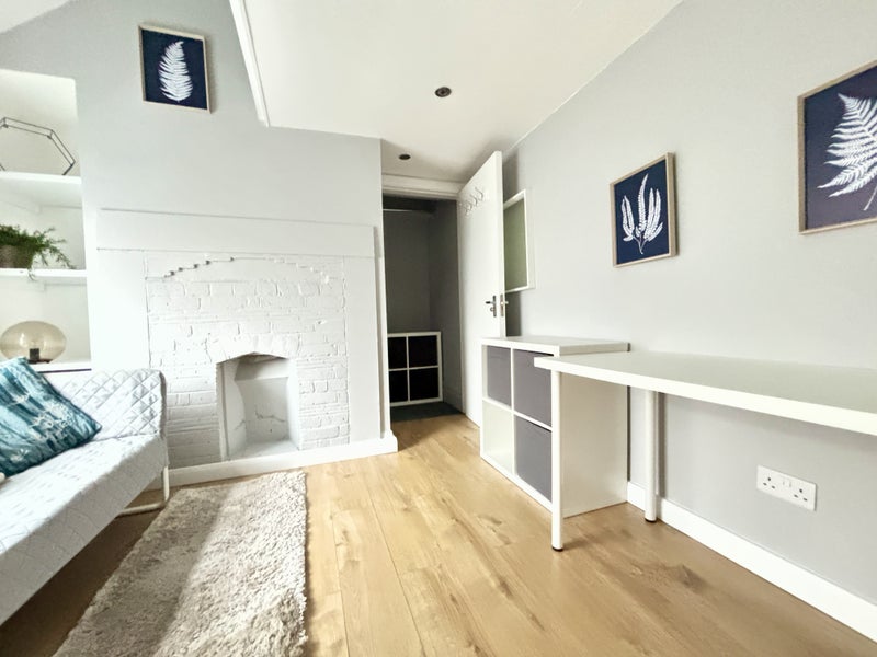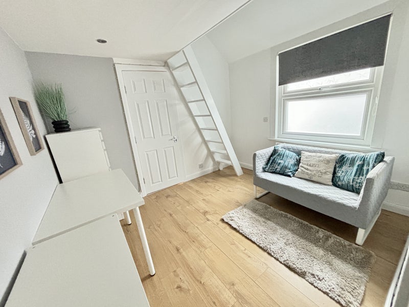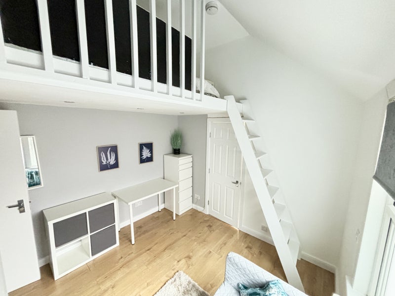 Brand new refurbished space with luxury bathroom, modern kitchen area and loft bed/living room part furnished if required with wardrobe, drawers, desk, chair, sofa and double bed.
