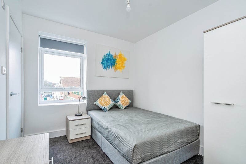 Communal facilities include the kitchen/living area and a shared bathroom (four bedrooms have their own en suites).