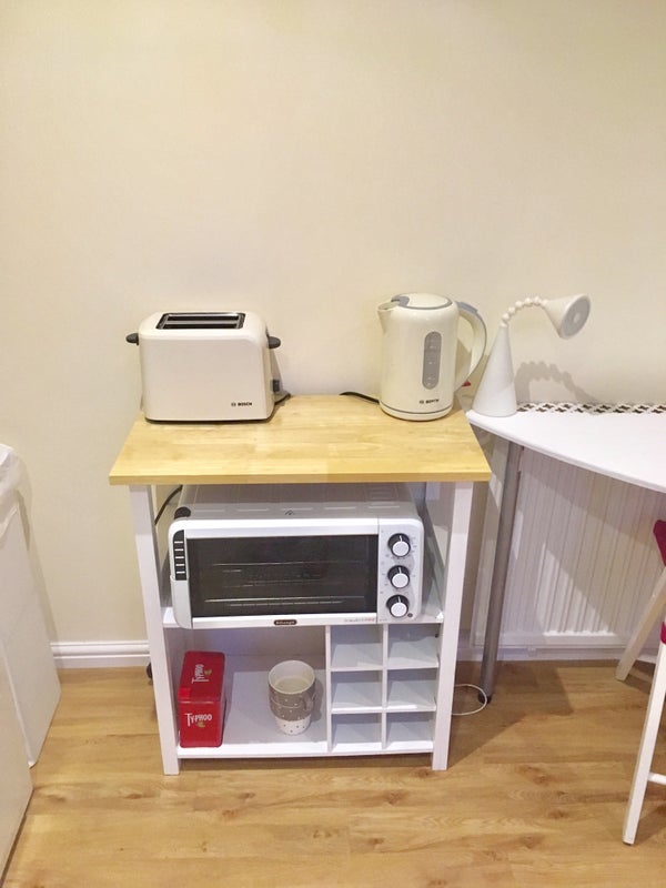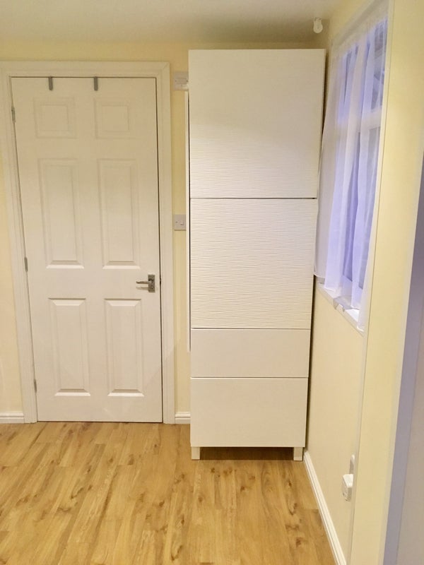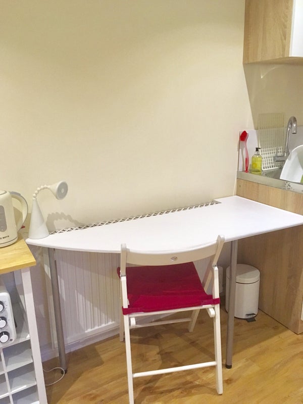 There is a small kitchenette with two hob rings for light cooking, a fridge, a small freezer and kitchen sink/cupboards. There is also a built-in desk and additional space for storage.