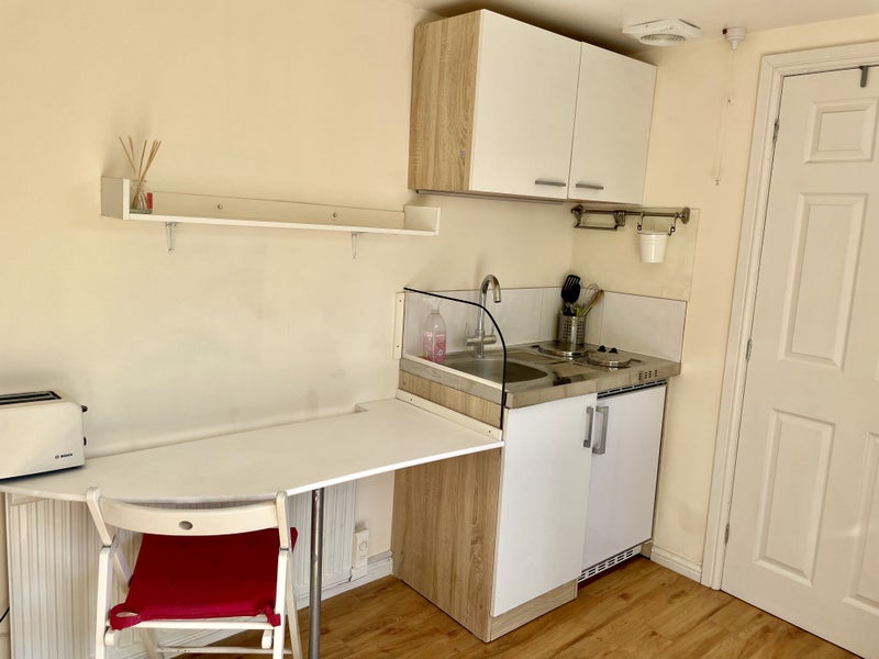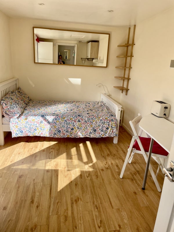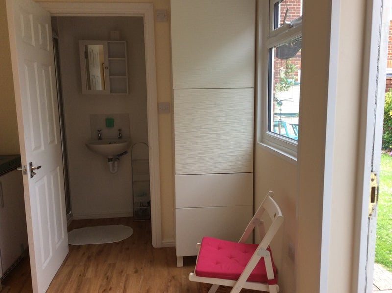 Light, modern and airy small studio in Burpham, Guildford. The studio flat is in a separate building at the end of our garden and has independent access through the garden gate. The studio has heating via radiators, fast wifi, an ensuite with electric shower and electric heated towel rail, small double bed, wooden floors, and is newly decorated throughout.