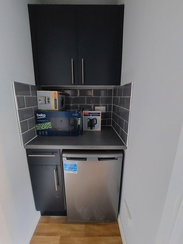 KITCHENETTE INCLUDES MICROWAVE, KETTLE, FRIDGE, TOASTER, CUPBOARD SPACE.