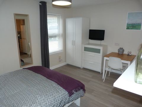 Studio with double bed, bedside tables, wardrobe, chest of drawers. Table with 2 chairs. Comfy Chair. TV