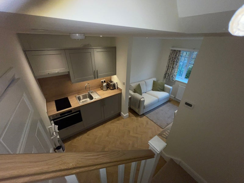 The apartment is self-contained with garden views and has its own private entrance. There is a living area and kitchen downstairs and a bedroom and ensuite bathroom upstairs.