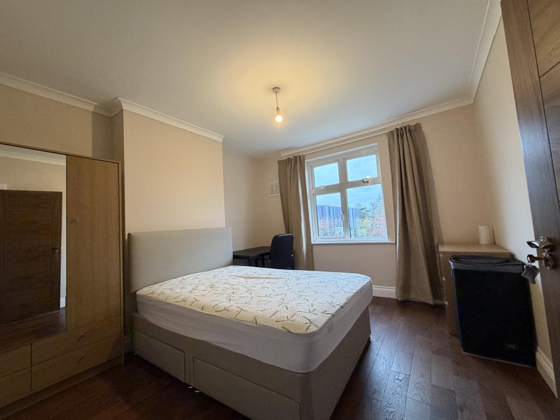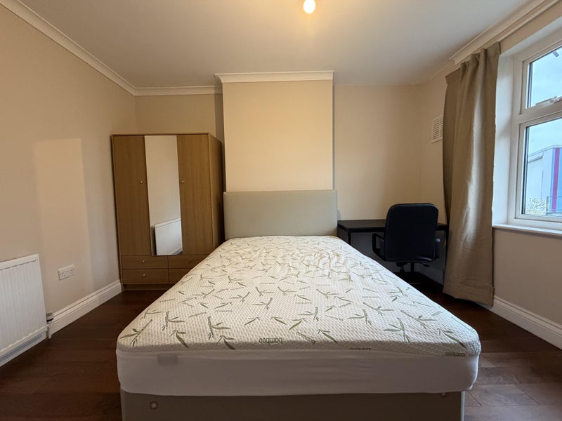 Bright, fully furnished double room available in a well-kept terraced house in Mitcham (CR4). The room is upstairs, garden-facing, and has been freshly painted with new curtains, giving it a clean, modern feel. It comes with a double bed, wardrobe, desk and chair, laundry basket, and bin. The house includes a shared kitchen and bathroom, fast Wi-Fi, all bills included, and the added benefit of a separate washer and dryer.