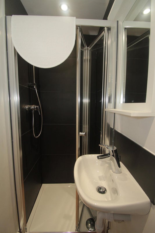 Contains power shower, wash hand basin with cupboard under and toilet.