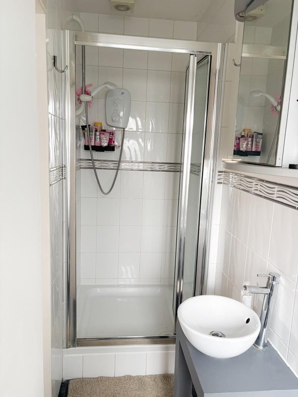 Shower Room - has a 1m by 1 m power shower, basin, toilet, mirrored cabinet, and wall heater.