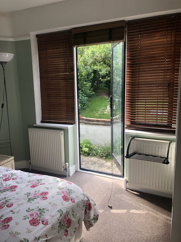 Clean and quiet house with the available double room at the back of the house, overlooking a large back garden leading onto woods with a raised balcony/patio area accessed from the room to the garden with table and chairs on the patio. All mod cons, w/m dishwasher/ tumble dryer etc etc. Large bathroom with separate shower and spa bath. Separate loo upstairs and another toilet downstairs..
