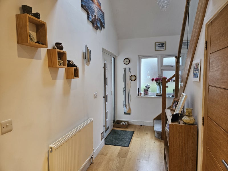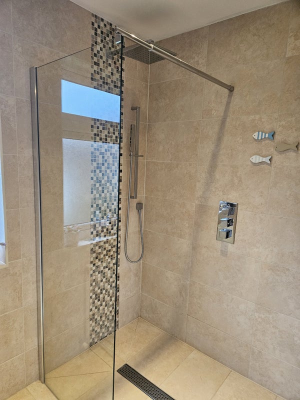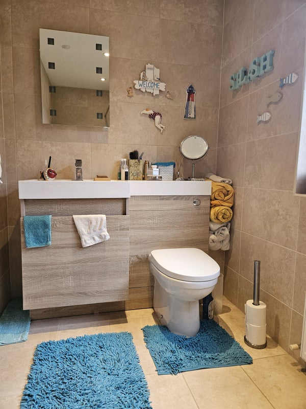 Large ensuite, which is tiled throughout and has a double walk in shower, heated towel rail and built in vanity unit with sink and wall hung toilet.