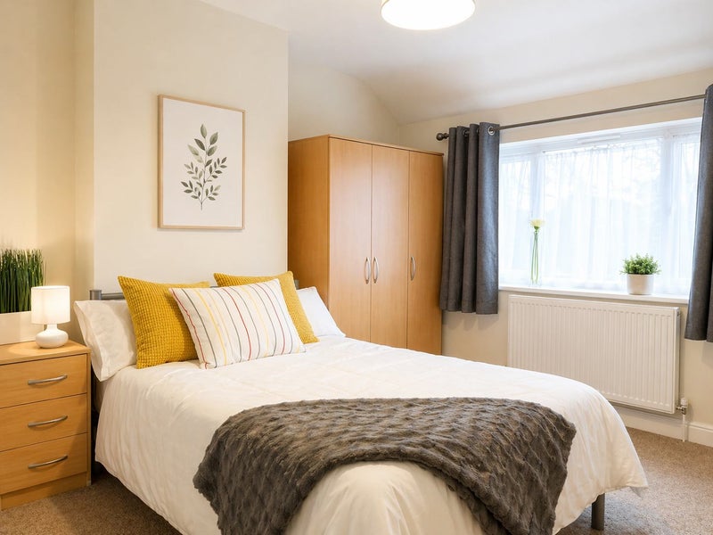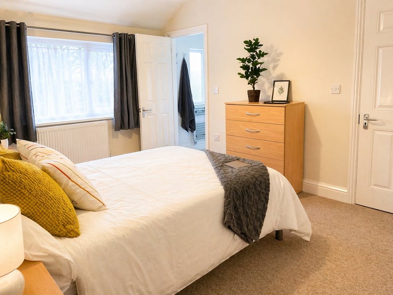 ✔️ Boutique-style double bedroom – Fully furnished with a double bed, wardrobe, chest of drawers, bedside table, desk, and chair.