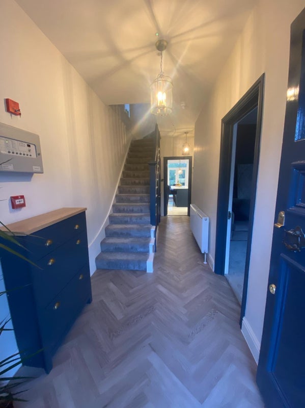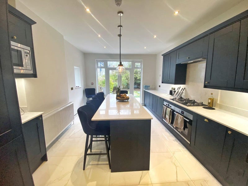 Our house is a large detached Victorian house in a quiet up-market area of South Croydon which has recently undergone an extensive high end refurb. All bedrooms are kitted out with luxury/modern furniture, carpet and newly built en-suite with rain-fall shower. We have a large stone-topped island kitchen with double doors opening to a lawned garden and patio BBQ area with new big BBQ, a communal lounge with 55” tv and co-working space with fast Virgin business wifi.
