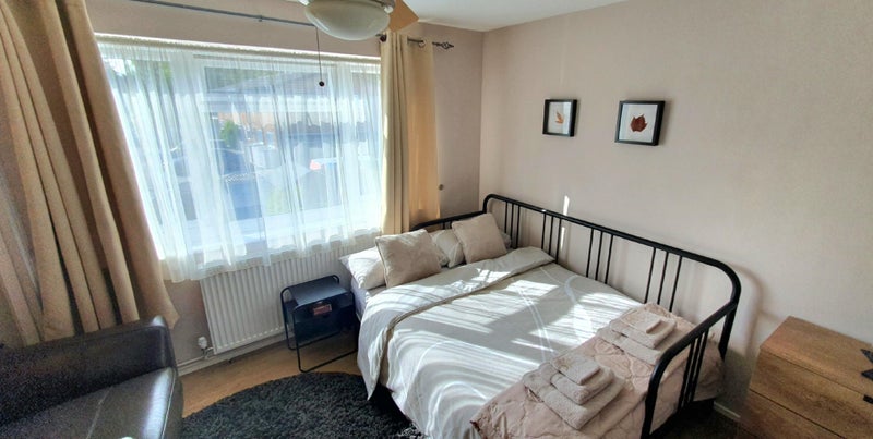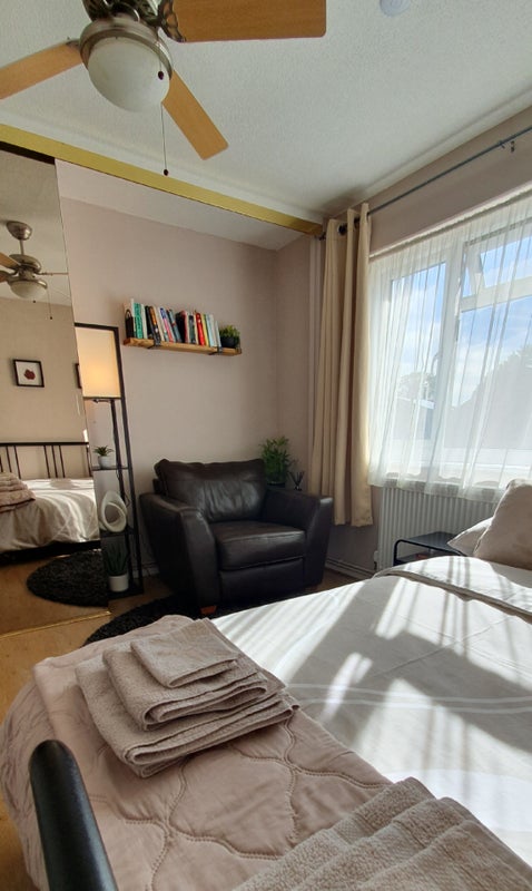A bright and spacious double bedroom is available in a lovely two-bedroom house from 18th November. The house features a cosy living room, modern bathroom, fully equipped kitchen, and a garden.