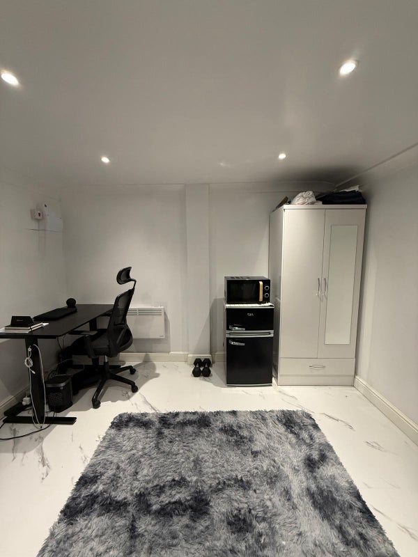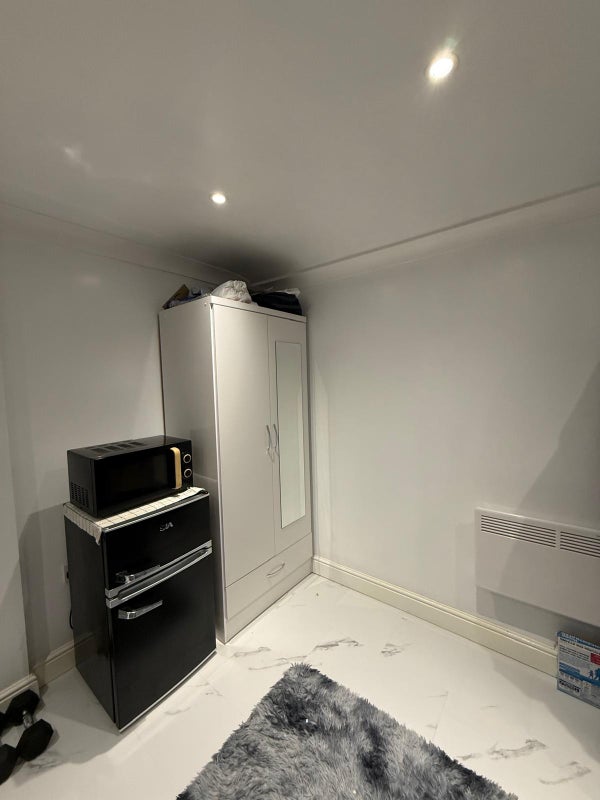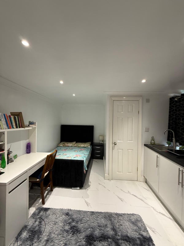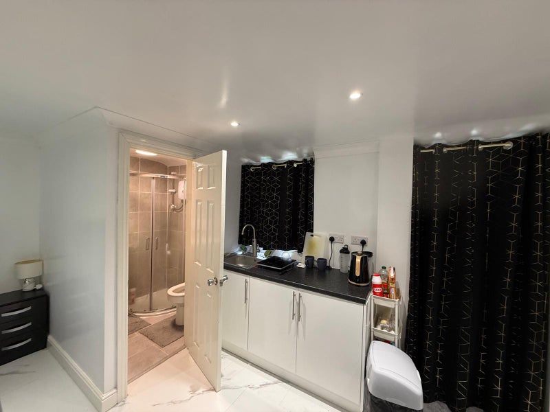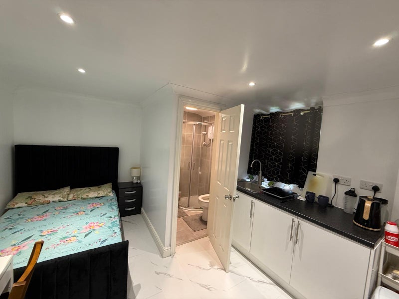 The property is modern and recently built, featuring a spacious bedroom furnished with a bed, mattress, wardrobe, and table. It also includes a private bathroom equipped with a shower, basin, and toilet. A compact kitchenette is provided, containing a small fridge and freezer, microwave, and kettle; please note, a traditional cooker is not included. However, induction cooker can be arranged upon request. This is a massive sized room, perfect for comfortable living. This studio flat is huge and bright and spacious.