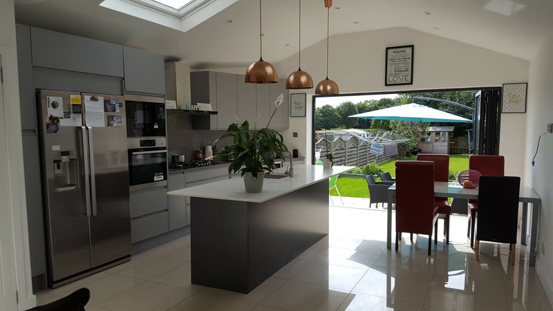 The kitchen is a contemporary kitchen with living area furnished with TV and comfy sofas.