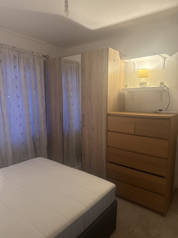 The double room is fully furnished with a bed, wardrobe, and drawers.