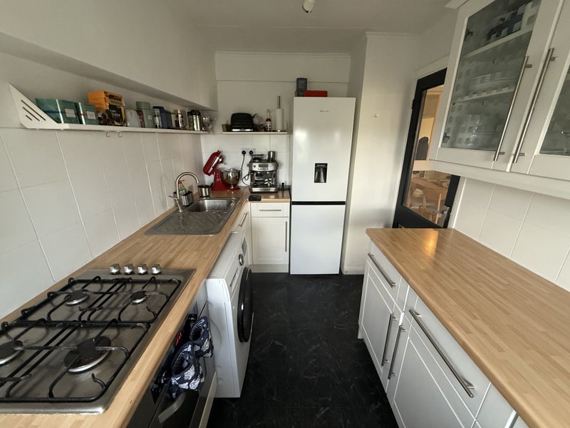 The kitchen is fitted with a washing machine and a tumble dryer.