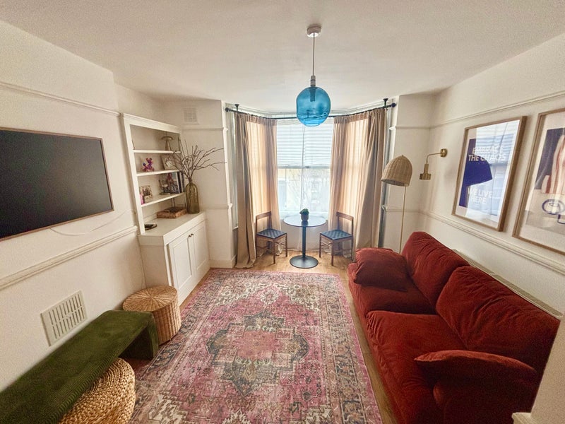 The flat is tastefully furnished throughout and offers a warm, modern feel with character features. The shared living area is bright and inviting, featuring a large bay window, neutral décor, a comfortable sofa, dining space, and stylish artwork – ideal for relaxing or entertaining.