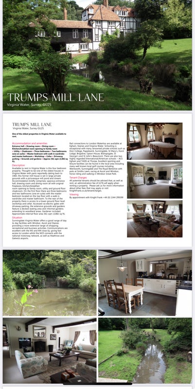 An enchanting former Mill house reputed to be one of the oldest houses in Virginia Water with parts dating back to 1483. Set in extensive grounds of approximately 13 acres and currently offering good size rooms for accommodation with Located at the end of a lane yet within easy reach of the village centre